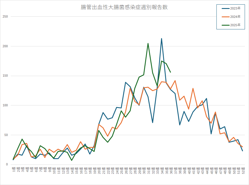 2025 年は、第 36 週までの速報値で全国累計 759 例が報告されており、夏場にかけて急速に増加しました。とくに第 30 週前後には過去数年を上回る水準に達し、警戒が必要とされています。今年の特徴としては、O157 だけでなく O103 という血清群の増加が注目されました。O103 の届出は従来の平均を大きく上回っており、無症状保有者の割合が半数以上を占めています。これは症状が出ない人から周囲に感染が広がるリスクを示しており、保健所による疫学調査や接触者検査の重要性を改めて浮き彫りにしました。一方で、O157 は依然として最多株であり、全体の流行を牽引していることに変わりはありません。