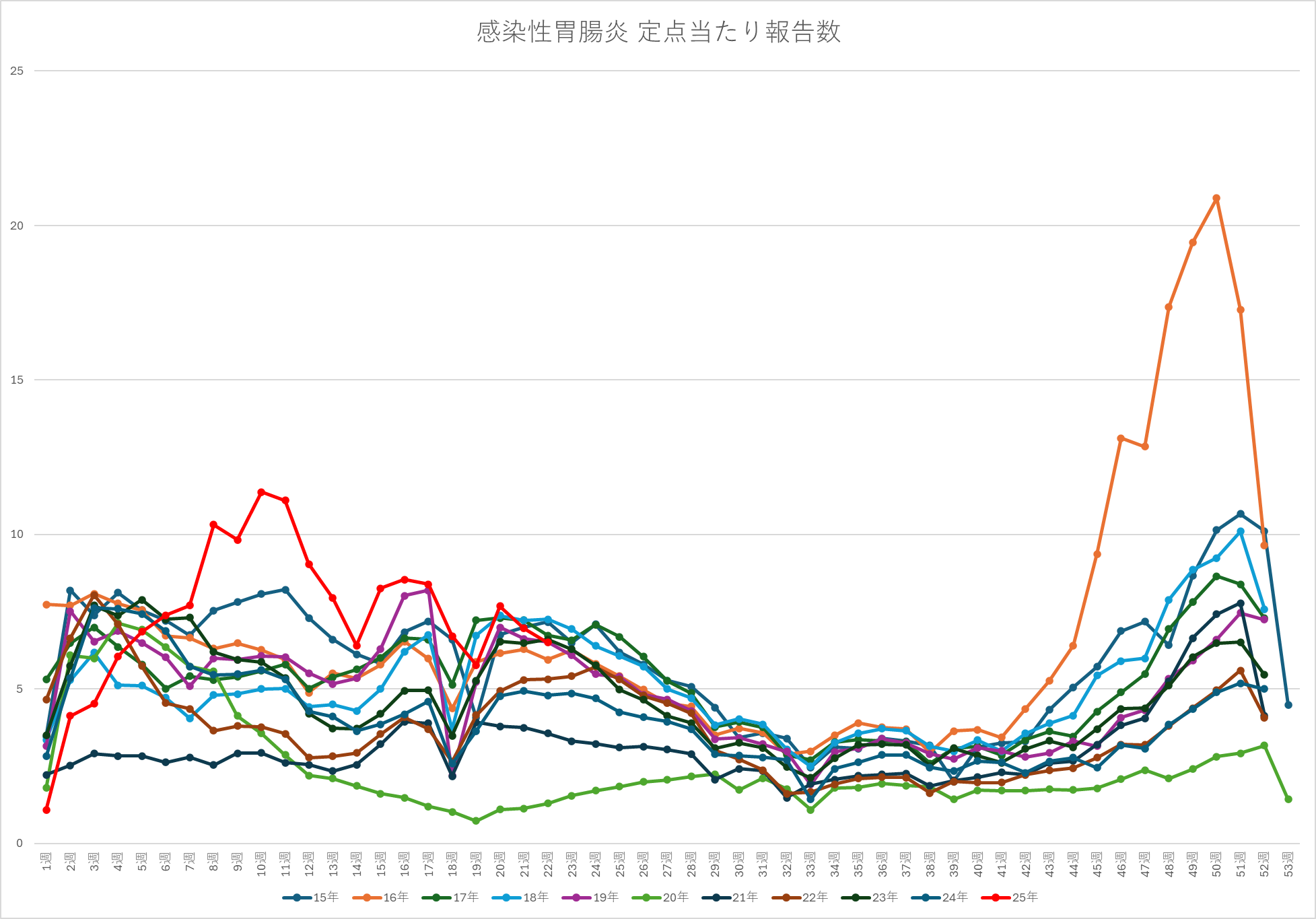 2025年の感染性胃腸炎は、例年を大きく上回る流行を見せています。以下のグラフは、過去10年間の週ごとの定点当たり報告数を比較したものです。
